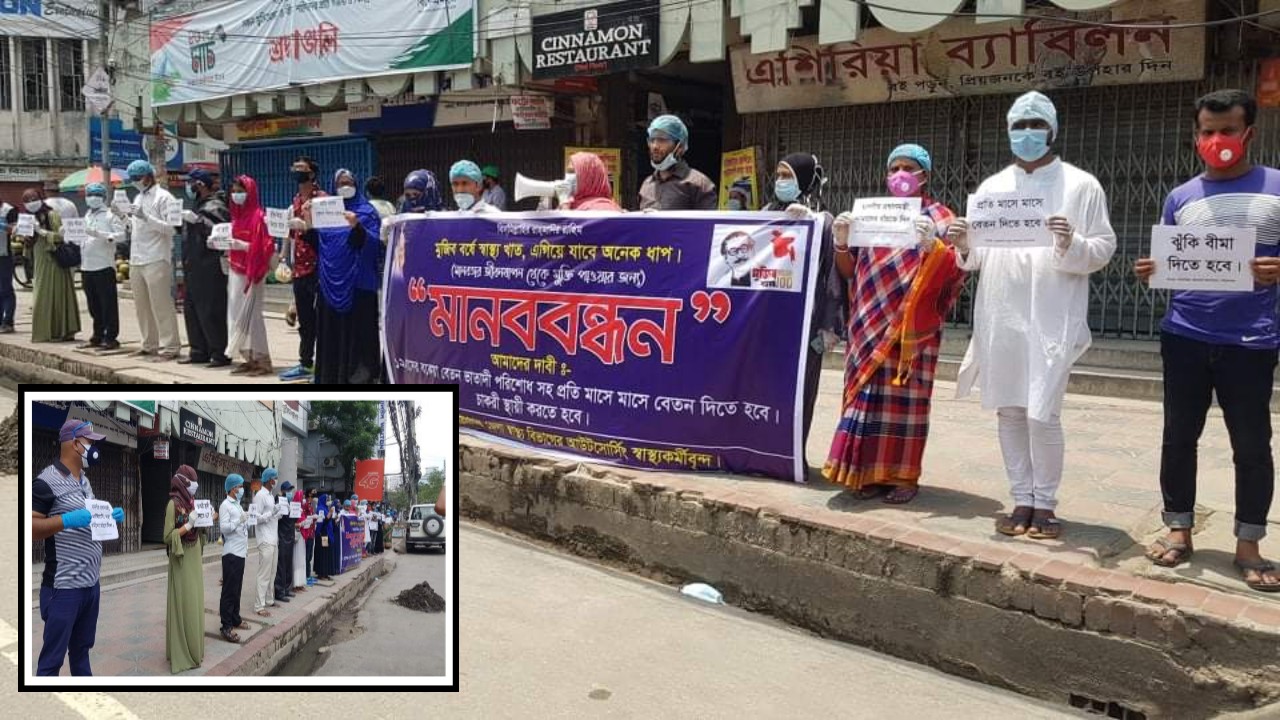 এক বছরের বেতনের দাবিতে স্বাস্থ্যকর্মীদের মানববন্ধন