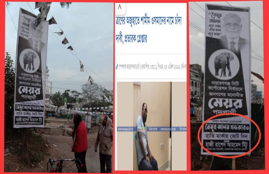 কিন্তু বুধবার ভোরে নগরীতে প্রাতঃভ্রমণকালে ক্রাইমজোনখ্যাত জিমখানার মন্ডলপাড়া ব্রীজের কাছে এসে নগরবাসীর সৃষ্টি আটকে গেছে কয়েকটি বিশাল ফ্যাস্টুনে। অনেকেই দেখছেন আর মন্তব্য করছেন সেই কুখ্যাত ছিনতাইকারী এবং পুরো নারায়ণগঞ্জের ছিনতাইকারীদের মূল হোতা সেই রাশেদ আহমেদ টিটু ওরফে ছিনতাইকারী টিটু ছট করে আবার এতোদিন পর কোথা থেকে এলো ? তাও আবার তৈমূর আলম খন্দকারের নির্বাচনী প্রচারণার অংশ হিসেবে।