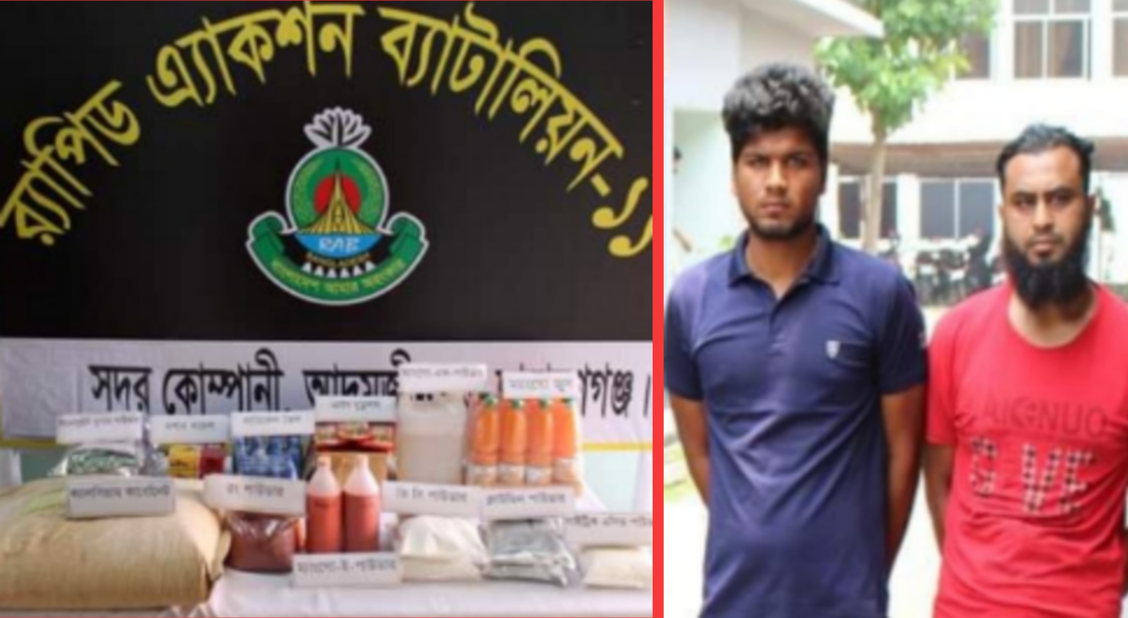 নারায়ণগঞ্জ জেলার সিদ্ধিরগঞ্জ থানাধীন শিমরাইল এলাকায় অননুমোদিত কারখানায় ভেজাল ও মানহীন খাদ্য পানীয় তৈরির সময় হাতেনাতে ২ জনকে গ্রেফতার করা হয়েছে।