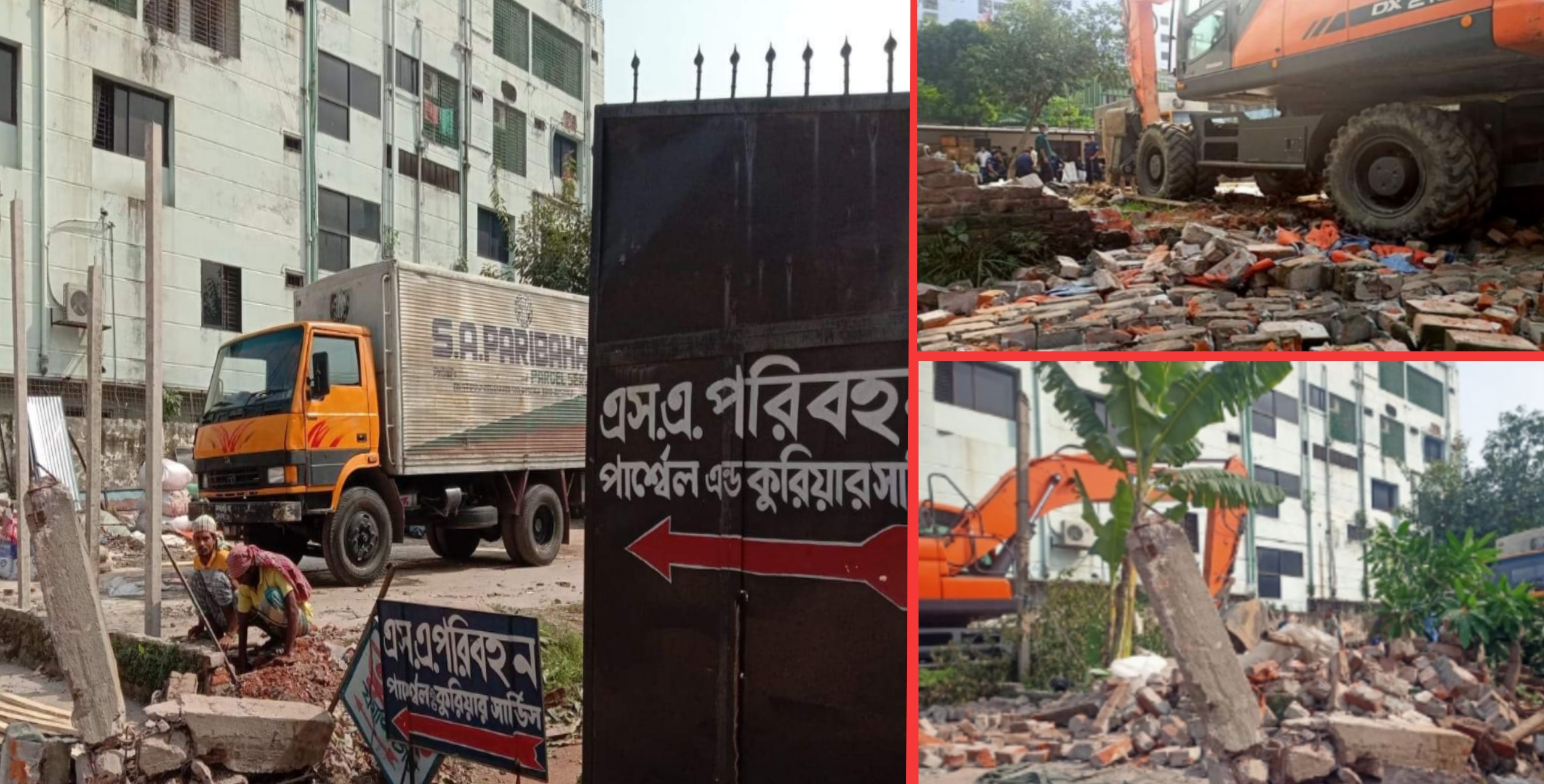 ৫ নভেম্বর বৃহস্পতিবার দুপুরে সলিমুল্লা সড়কের মেডিস্টার হাসপাতালের পাশে ‘এসএ পরিবহন কুরিয়ার সার্ভিস’ নামে প্রতিষ্ঠানের গেট ও দেওয়াল ভেঙে দেয় সিটি করপোরেশনের কর্মীরা।