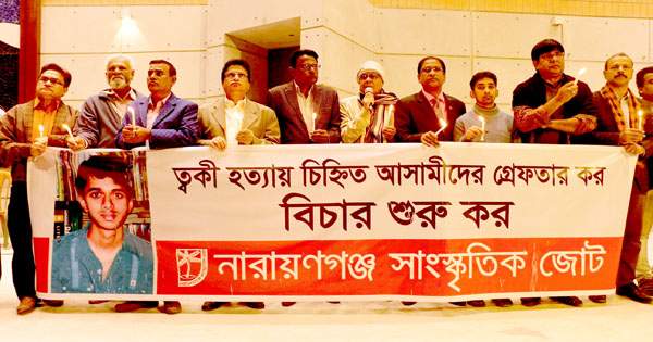 শনিবার (৮ ফেব্রæয়ারি) নগরের আলী আহাম্মদ চুনকা নগর পাঠাগার ও মিলনায়তন প্রাঙ্গণে ত্বকী হত্যার ৮৩ মাস পূর্তি উপলক্ষ্যে ‘চিহ্নিত খুনীদের গ্রেপ্তার ও বিচারের দাবিতে’ নারায়ণগঞ্জ সাংস্কৃতিক জোট আয়োজিত ধারাবাহিক মোমশিখা প্রজ্জ্বালন কর্মসূচীতে রফিউর রাব্বি এ কথা বলেন।