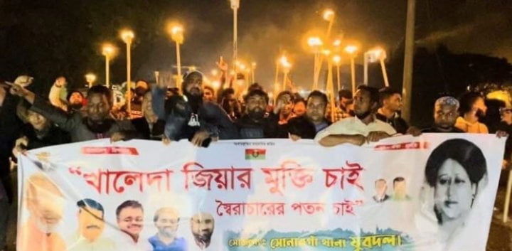 বিএনপি চেয়ারপারসন বেগম খালেদা জিয়ার মুক্তি ও বিদেশে চিকিৎসার দাবিতে মশাল মিছিল করেছেন সোনারগাঁ থানা যুবদলের নেতাকর্মীরা।