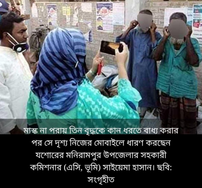 সংবিধানের ৩৫’র ৫ অনুচ্ছেদে স্পষ্ট বলা হয়েছে: ‘কোনো ব্যক্তিকে যন্ত্রণা দেওয়া যাইবে না কিংবা নিষ্ঠুর, অমানুষিক বা লাঞ্ছনাকর দণ্ড দেওয়া যাইবে না কিংবা কাহারও সহিত অনুরূপ ব্যবহার করা যাইবে না।’ এই বিধান অনুযায়ী, মনিরামপুরের এসি ল্যান্ড সাইয়েমা সপষ্টতই সংবিধান লঙ্ঘন করেছেন এবং এ কারণে এটি সরকারি কর্মচারী (শৃঙ্খলা ও আপিল) বিধিমালা ২০১৮’রও লঙ্ঘন। তৃতীয়ত, তিনি নিজে একটি ভয়াবহ অপরাধ করে সেই ঘটনার ছবি ক্যামেরাবন্দি করেছেন এবং সেই ছবি ইন্টারনেটে ছড়িয়ে গেছে। ফলে এটি ডিজিটাল নিরাপত্তা আইনের বিধান মতেও অপরাধ। যদিও এই আইনটি নিয়ে অনেক বিতর্ক আছে এবং বলা হয়, এই আইনটি করা হয়েছে নাগরিকদের হয়রানি করতে। কিন্তু নির্মম বাস্তবতা হলো, এই আইনে প্রথম শাস্তি পেয়েছেন একজন সরকারি কর্মচারীই। মাদ্রাসাছাত্রী নুসরাতের জবানবন্দি রেকর্ড করে তা ইন্টারনেটে ছড়িয়ে দেওয়ার দায়ে আট বছর সশ্রম কারাদণ্ড দেওয়া হয় ফেনীর সোনাগাজী থানার সাবেক ওসি মোয়াজ্জেম হোসেনকে।