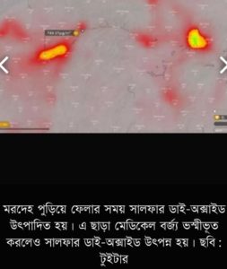 স্যাটেলাইট ইমেজ দিয়ে খবরে বলা হয়েছে, চীনে করোনাভাইরাসে আক্রান্ত ১০ হাজার ব্যক্তির মৃতদেহ জ্বালিয়ে দিয়েছে দেশটি। বিশ্বব্যাপী আতঙ্কের মধ্যে উহান শহরে উচ্চমাত্রার সালফার ডাই-অক্সাইডের (SO2) ব্যাপক উপস্থিতির খবর পাওয়া যাচ্ছে। আর এতে সেখানকার করোনাভাইরাসে আক্রান্ত ব্যক্তিদের মরদেহ পুড়িয়ে ফেলার আভাস মিলছে। উহান শহর থেকেই করোনাভাইরাসের বিস্তার হয়।
