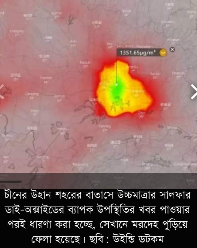 সম্প্রতি উহান শহরের স্যাটেলাইট ছবি প্রকাশিত হয়। ছবিতে দেখা যাচ্ছে, বাতাসে সালফার ডাই–অক্সাইডের মাত্রা এত তীব্র যে ওই এলাকাগুলো আলাদা করে চিহ্নিত করা যাচ্ছে। ওই অঞ্চলে বাতাসে সালফার ডাই–অক্সাইডের মাত্রা প্রতি ঘনমিটারে ১ হাজার ৩৫০ মাইক্রোগ্রাম পার কিউবিক মিটার (g/m3)। প্রতি ঘনমিটারে ৮০০–এর বেশি সালফার ডাই–অক্সাইড থাকলে তা যথেষ্ট ক্ষতিকর বলে মনে করা হয়। মরদেহ পুড়িয়ে ফেলার সময় এই সালফার ডাই-অক্সাইড উৎপন্ন হয়। এ ছাড়া মেডিকেল বর্জ্য ভস্মীভূত করলেও সালফার ডাই-অক্সাইড উৎপন্ন হয়। চীনের উহান শহরে এ ধরনের মাত্রা বৃদ্ধি পাওয়ায় ধারণা করা হচ্ছে, উহানে করোনাভাইরাসে আক্রান্ত মানুষকে পুড়িয়ে ফেলা হয়েছে।