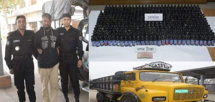 মাল বোঝাই ট্রাকে অভিনব কৌশলে ফেনসিডিল পাচারকালে ৪৪৭ বোতল ফেনসিডিল উদ্ধার করেছে র্যাব- ১১।