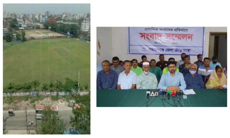 তবে সংবাদ সম্মেলনে এসব অভিযোগ অস্বীকার করেছেন নারায়ণগঞ্জ জেলা ক্রীড়া সংস্থার সাধারণ সম্পাদক তানভীর আহমেদ টিটু। তিনি বলেন, ‘পত্রিকায় উদ্দেশ্যমূলক খবর পরিবেশন করে জেলা ক্রীড়া সংস্থার ভাবমূর্তি ক্ষুন্ন করতে চাচ্ছে। সাবেক রাষ্ট্রপতি হুসেইন মুহাম্মদ এরশাদের আমলে তৎকালীন নারায়ণগঞ্জ পৌরসভার চেয়ারম্যান নাজিমউদ্দিন সাহেব ক্রীড়া সংস্থার উন্নয়নের জন্যে এই ভূমিটি দান করেন। ২০১১ সালে আমি ক্রীড়া সংস্থার দায়িত্ব নেবার পর থেকে পূর্ণাঙ্গ স্টেডিয়াম করার কাজ শুরু করি। পুরাতন মাঠটিকে পূর্ণাঙ্গ স্টেডিয়াম করার জন্য কিছু জায়গার প্রয়োজনীয়তা দেখা দেয়। তখন আমরা আমাদের কমিটি মিটিংয়ে সিদ্ধান্ত নেই যে, জায়গার ব্যবস্থার জন্য ডিসির কাছে আবেদন করবো। তখন আকসির (কে ইউ আকসির) চাচা প্রস্তাব রাখেন যে, কিছু জায়গা অধিগ্রহণ করে দেয়ার জন্য। তখন অর্থ না থাকায় সেই জমিটুকু অধিগ্রহণ করতে পারেনি। তখন ২০১৬ সালে আমাদের এজিএমে (বার্ষিক সাধারণ সভা) এওয়াজ বদলের প্রস্তাব রাখি। তখন সবাই সে বিষয়ে সম্মতি জানায়। ক্রীড়া সংস্থার খেলার মাঠ উন্নয়নে সর্বোচ্চ সম্ভাব্যতা যাচাই করেই ভূমির এওয়াজ বদলের কাজটি অধিকতর সুবিধা নিয়েই সম্পন্ন করা হয়েছে।’