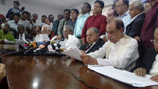 আসন্ন জাতীয় সংসদ নির্বাচনের বিষয়ে নিজেদের অবস্থান জানাতে আজ এই সংবাদ সম্মেলনের আয়োজন করে জাতীয় ঐক্যফ্রন্ট। দুপুর সোয়া ১টায় ওই সংবাদ সম্মেলন শুরু হয়। ড. কামালের পর বক্তব্য রাখেন ঐক্যফ্রন্টের মুখপাত্র ও বিএনপির মহাসচিব মির্জা ফখরুল ইসলাম আলমগীর। তিনি বলেন, ‘তড়িঘড়ি করে একাদশ জাতীয় সংসদের তফসিল ঘোষণা প্রমাণ করে সরকার সংলাপের পর কোনও সমঝোতায় যায়নি। কোনও শর্তই সরকার পালন করেনি। এই পরিস্থিতিতে গ্রহণযোগ্য নির্বাচন হওয়া অসম্ভব ব্যাপার। তার পরও জাতীয় ঐক্যফ্রন্ট নির্বাচনে অংশ নেওয়ার সিদ্ধান্ত নিয়েছে।’