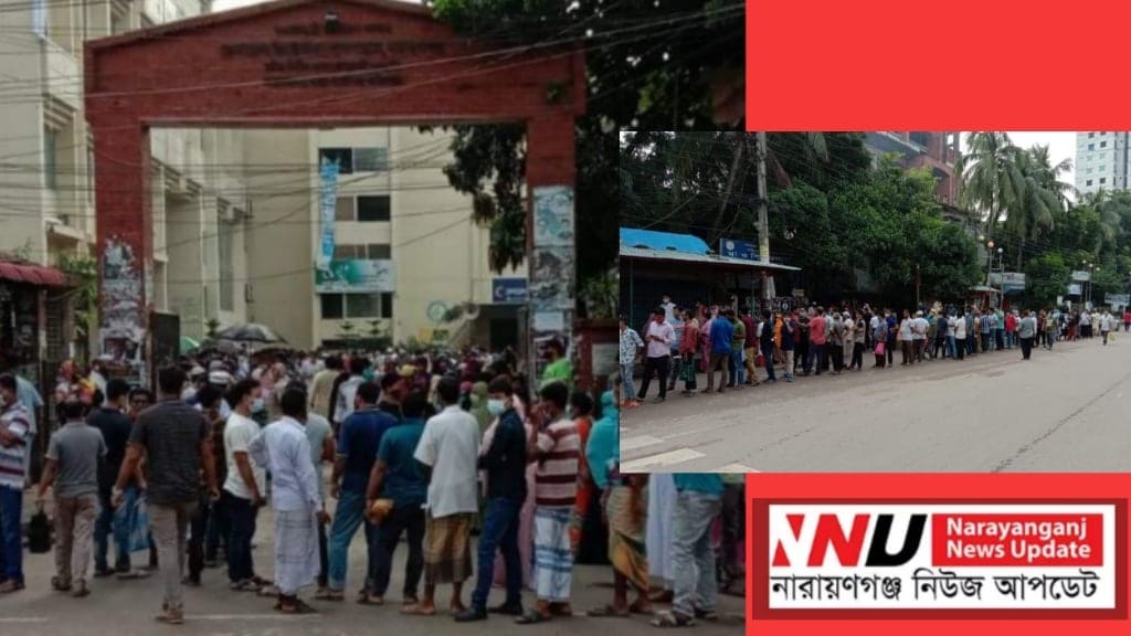 দেশে সম্প্রসারিত টিকা কার্যক্রমের ষষ্ট দিন আজ ১২ আগষ্ট বৃহস্পতিবার । প্রতিদিনের মতো বৃহস্পতিবার সকালের আলো ফুটে উঠার আগে থেকেই অনেকেই ভীড় করেছেন নারায়ণগঞ্জ জেনারেল হাসপাতালের । সকালের সূর্য উঠার সাথে সাথেই পাল্লা দিয়ে বাড়তে থাকে টিকা গ্রহণের জন্য আসা হাজারো মানুষের ভীড় । জেনারেল (ভিক্টোরিয়া) হাসপাতালে মূল ভবনের নীচতলা থেকে শুরু করেে এই লম্বা লাইন ঠেকেছে নগরীর বঙ্গবন্ধু সড়কস্থ নারায়ণগঞ্জ সিটি কর্পোরেশনের গেইট পর্যন্ত। সকাল সাতটা কুড়ি মিনেটের এমন দৃশ্যই অনুমান করা যায় আজ বৃহস্পতিবার কতটা ধকল সৃষ্টি হবে হাসপাতালে।