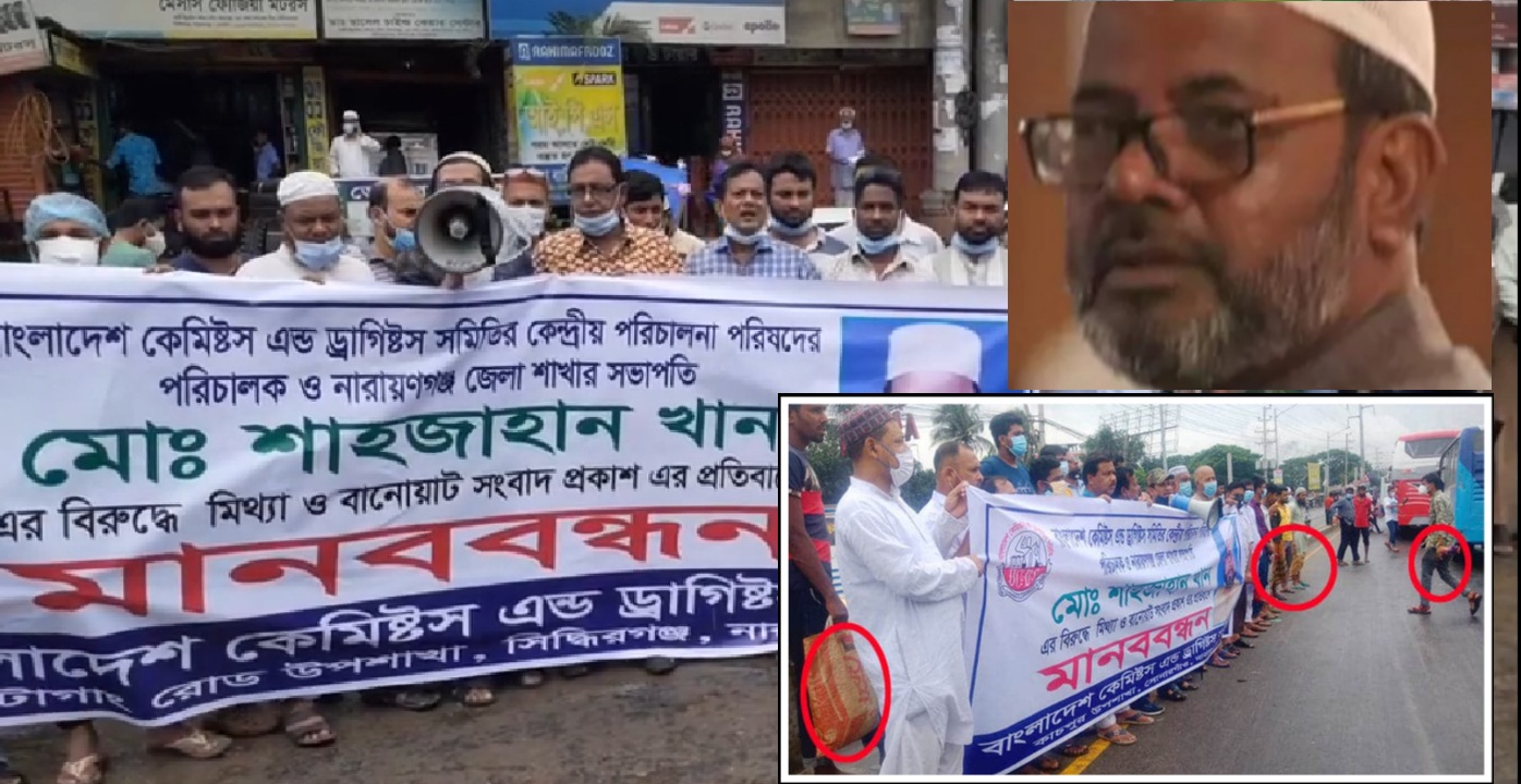 এছাড়াও চিটাগাং রোডের মানববন্ধনে লোক দেখা গেলেও তারা ছিলেন আদমজী, মিজমিজি এলাকার গুটি কয়েক ফার্মেসী ব্যবসায়ী এবং বাকিরা লুঙ্গি ও বাজারের ব্যাগ হাতে শ্রমিক, পথচারী। কিন্তু দেখা যায়নি ভুক্তভোগী প্রকৃত ফার্মেসী ব্যবসায়ীদের। শুধু বিসমিল্লাহ ফার্মেসী মালিক আজিজকে ভয় দেখিয়ে আনা হলেও ওইদিন শাহজাহান খাঁনের অবস্থানের ফুটেজ ও পৃর্বে আজিজের দেয়া বক্তব্য সাংবাদিকদের কাছে সুস্পষ্ট প্রমাণ রয়েছে বলে জানা গেছে।