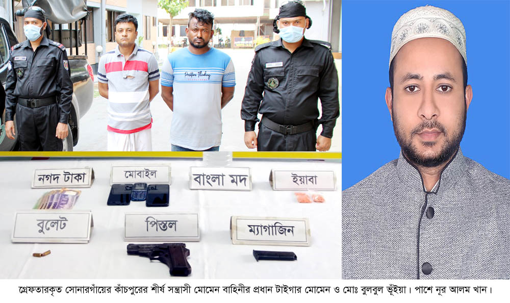 নারায়ণগঞ্জের সোনারগাঁয়ের কাঁচপুরের শীর্ষ সন্ত্রাসী টাইগার মোমেন অস্ত্রসহ গ্রেফতার হওয়ায় এলাকায় স্বস্তি বিরাজ করছে। শুক্রবার উপজেলার কাঁচপুর ওলামানগর এলাকা থেকে র্যাবের একটি দল কাঁচপুরের মোমেন বাহিনীর প্রধান টাইগার মোমেন ও তার সহযোগী মোঃ বুলবুল ভূঁইয়াকে গ্রেফতার করে। এ সময় তাদের কাছ থেকে ম্যাগাজিন ভর্তি একটি বিদেশী পিস্তল, দুই রাউন্ড তাজা গুলি, ২০০ পিস ইয়াবা ট্যাবলেট, এক লিটার বাংলা মদ, মাদক বিক্রয়ের নগদ ১০ হাজার টাকা ও তিনটি মোবাইল ফোন উদ্ধার করা করা হয়।