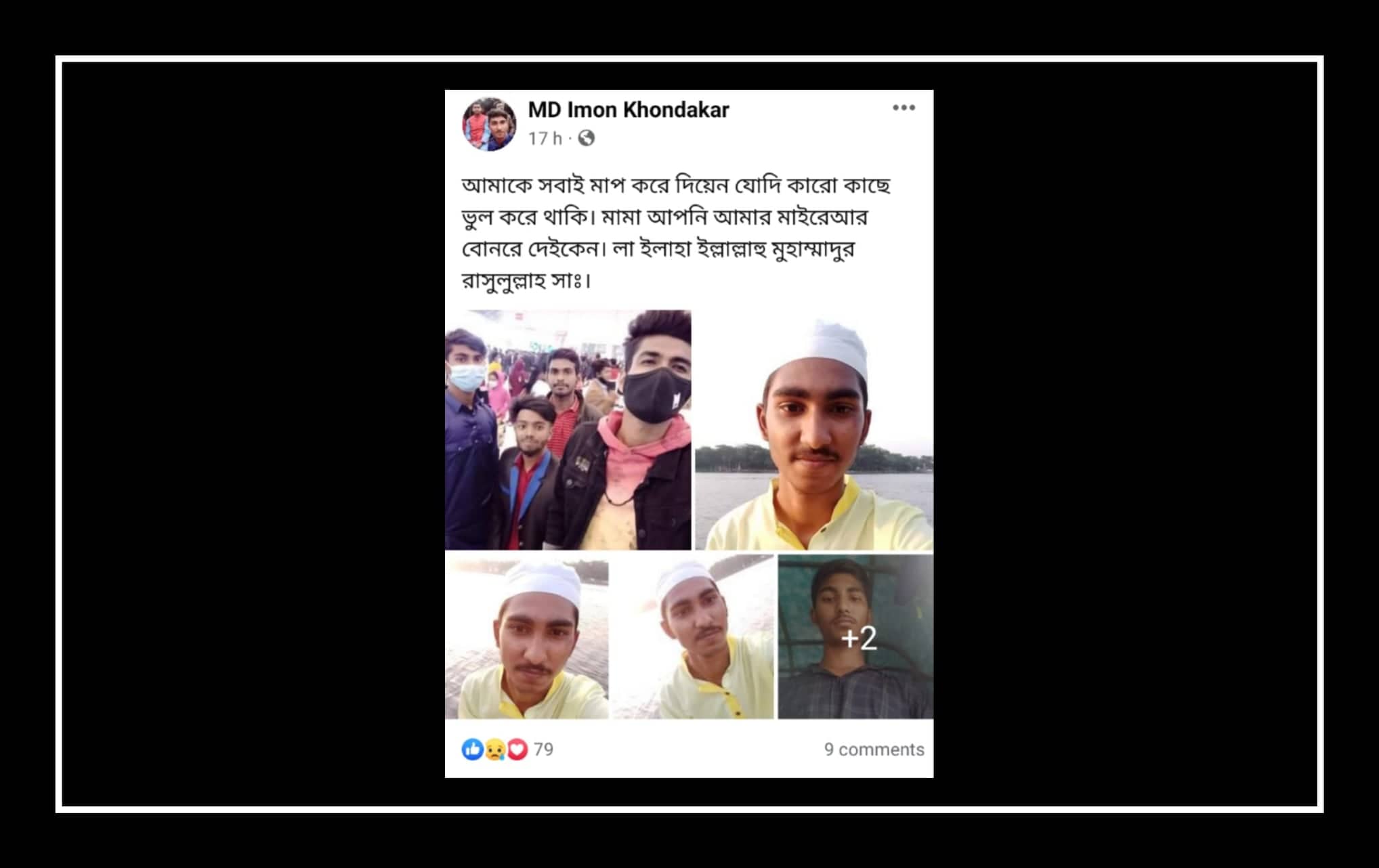 “আমাকে সবাই মাপ করে দিয়েন, যোদি কারো কাছে ভুল করে থাকি। মামা আপনি আমার মাইরে আর বোনরে দেইকেন। লা ইলা ইল্লাল্লাহু মুহাম্মাদুর রাসুলুল্লা সাঃ”