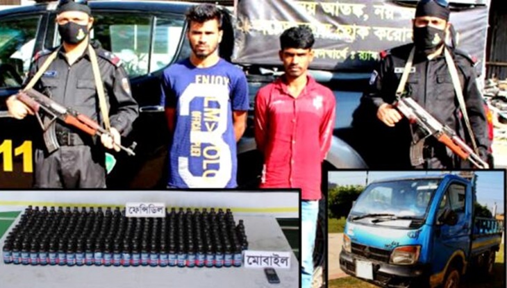 বিজ্ঞপ্তিতে র্যাব জনায়, মোগরাপাড়া চৌরাস্তায় একটি পিকআপ তল্লাশি করে ৩০০ বোতল ফেন্সিডিলসহ দুই যুবককে আটক করেছে র্যাব। এসময় মাদক পরিবহনের কাজে ব্যবহৃত ১টি পিকআপ জব্দ করা হয়েছে। আটককৃতরা পেশাদার মদক কারবারি। তারা দীর্ঘদিন ধরে বিভিন্ন কৌশলে ফেনসিডিল সংগ্রহ করে। এরপর পিকআপে করে ঢাকা, নারায়ণগঞ্জ ও এর আশপাশের এলাকায় সরবরাহ করে আসছিল। মাদকের মতো সামাজিক ব্যাধির বিরুদ্ধে র্যাব-১১ এর অভিযান অব্যাহত থাকবে বলে জানানো হয় বিজ্ঞপ্তিতে।
