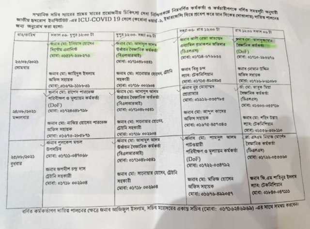বুধবার (২৫ আগস্ট) সকাল ৬টা থেকে দুপুর ১২টা পর্যন্ত উপ-সচিব পুলকেশ মন্ডল ও ট্রেইনি সহকারী জগদীশ চন্দ্র দাস, দুপুর ১২টা থেকে সন্ধ্যা ৬টা পর্যন্ত বিএলআরআইয়ের ঊর্ধ্বতন বৈজ্ঞানিক কর্মকর্তা মো. আসলামুল আলাম ও ট্রেইনি সহকারী মো. সানোয়ার হোসেন, সন্ধ্যা ৬টা থেকে রাত ১২টা পর্যন্ত ডিওএফের পরিবীক্ষণ ও মূল্যায়ণ কর্মকর্তা মো. সামছুল আলম পাটওয়ারী ও অফিস সহায়ক মো. মফিজ হোসেন, রাত ১২টা থেকে সন্ধ্যা ৬টা পর্যন্ত ডিএলএসের বৈজ্ঞানিক কর্মকর্তা ডা. এসএম নিয়াজ মোর্শেদ ও ল্যাব টেকনেশিয়ান জিএম শাহিনুর ইসলাম দায়িত্ব পালন করবেন।