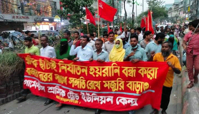 শ্রমিক ছাঁটাই-নির্যাতন হয়রানি বন্ধ করা ও জাতীয় নিম্নতম মজুরি ২০ হাজার টাকা করার দাবিতে গার্মেন্ট শ্রমিক ট্রেড ইউনিয়ন কেন্দ্র (জিটিইউসি)’র উদ্যোগে শুক্রবার (৮ অক্টোবর) বিকেল সাড়ে ৪ টায় নারায়ণগঞ্জ প্রেসক্লাবের সামনে শ্রমিক সমাবেশ ও শহরে বিক্ষোভ মিছিল অনুষ্ঠিত হয়।
