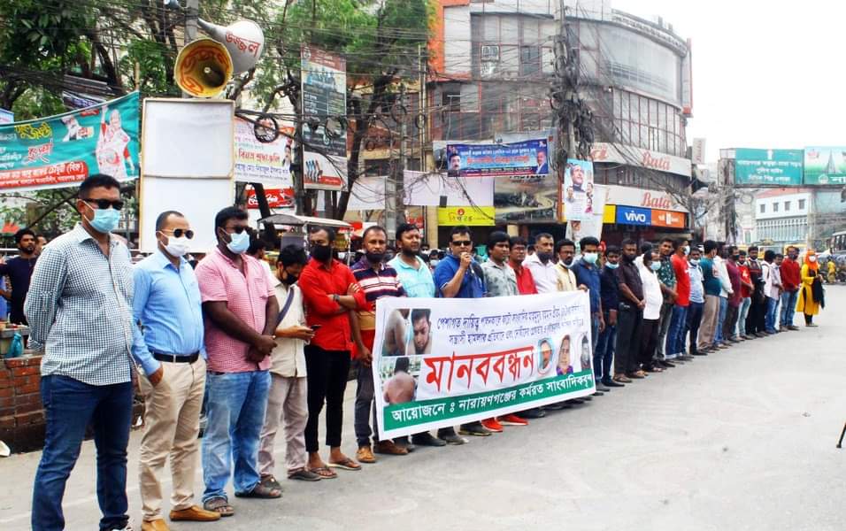 মহামারী করোনার প্রকোপ পুনরায় বাড়তে থাকায় এবং সড়ক অবরোধ করলে সৃষ্ট যানজটের ফলে মানুষের ভোগান্তির কথা বিবেচনা করে পূর্ব ঘোষিত সড়ক অবরোধ কর্মসূচীর পরিবর্তে আজ বুধবার (৩১ মার্চ) পুনরায় চাষাড়া শহীদ মিনারের সামনে ‘নারায়ণগঞ্জের কর্মরত সাংবাদিকবৃন্দ’র ব্যানারে এ মানববন্ধন অনুষ্ঠিত হয়।
