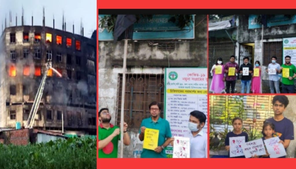 সজীব গ্রু‌পের অন্তর্ভুক্ত হাসেম ফুডস এন্ড বেভারেজের অঙ্গ প্রতিষ্ঠান সেজান জুস ফ্যাক্টরিতে মর্মান্তিক অগ্নিকাণ্ডে নারী ও শিশু শ্রমিক সহ ৫২ জনের প্রাণহানির প্রতিবাদে ও আহত শ্রমিকদের সুষ্ঠু চিকিৎসা ও শ্রমিকদের বেতন ভাতা পরিশোধের দাবিতে খেলাঘর নারায়ণগঞ্জ জেলার আহ্বানে আজ ১৪ জুলাই ২০২১ বুধবার সন্ধ্যা ৭ টায় স্ব স্ব স্থানে থেকে মোমশিখা প্রজ্জ্বালন করে।