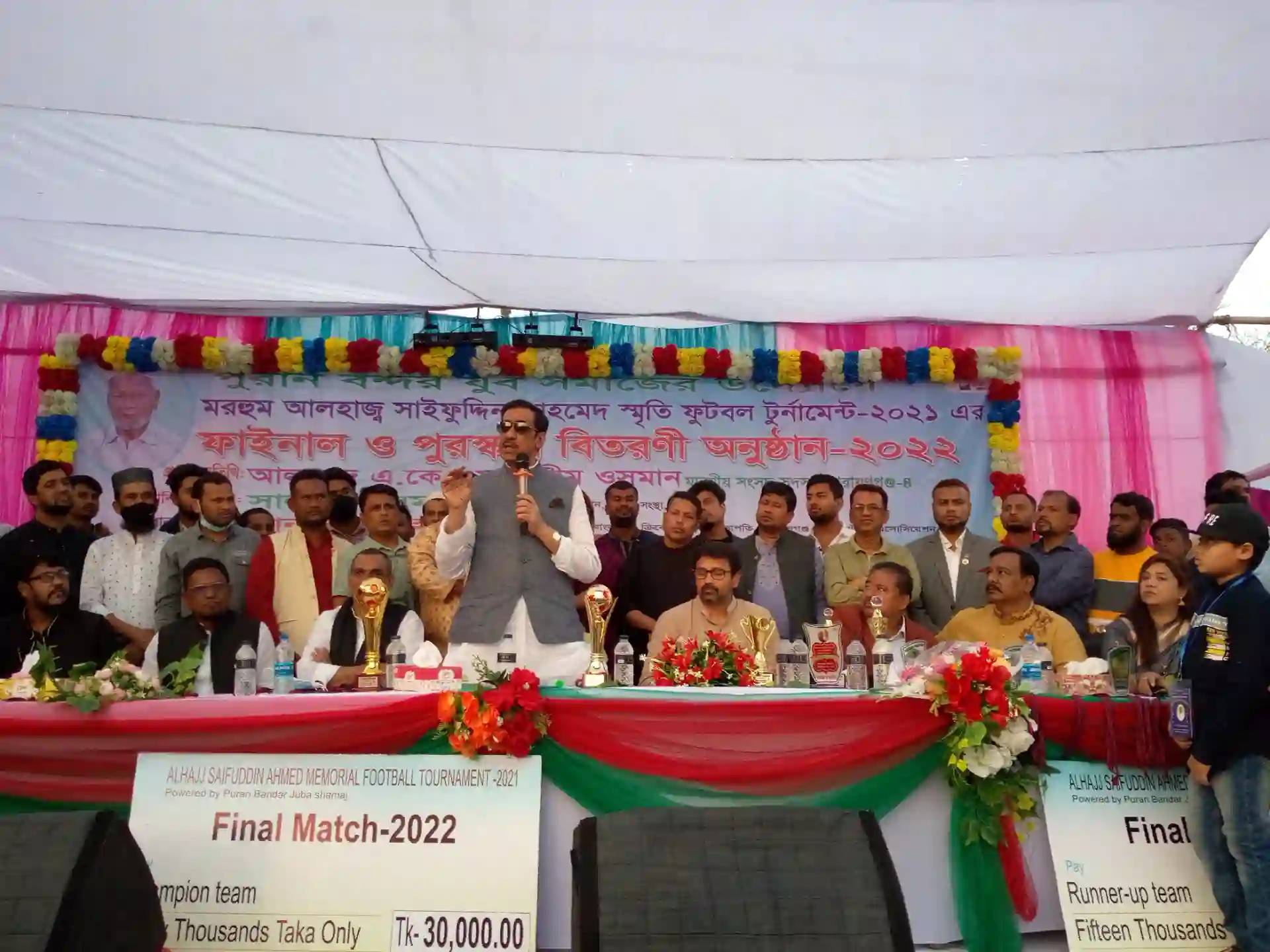 শুক্রবার (২৫ ফেব্রুয়ারী) বিকেল ৪টায় পুরান বন্দর যুব সমাজ কর্তৃক আয়োজিত মরহুম আলহাজ্ব সাইফুদ্দিন আহাম্মেদ ফুটবল টুনামেন্টের ফাইনাল খেলা ও পুরস্কার বিতরণী অনুষ্ঠানে প্রধান অতিথির বক্তব্যে তিনি এ সব কথা বলেন। এমপি শামীম ওসমান আরো বলেন, নারায়ণগঞ্জে রাজধানী হলো বন্দর। বন্দরে নগরী হলো নারায়ণগঞ্জ। বঙ্গবন্ধুকে হারিয়ে আমরা অনেক পিছিয়ে গেছি। জননেত্রী শেখ হাসিনাকে আমরা হারাতে চাই না। দুনিয়াতে আমরা অল্প সময়ের জন্য এসেছি। যাওয়ার সময় হয়ে গেছে । আমার বড় ভাই প্রয়াত সাংসদ একেএম নাসিম ওসমান বন্দরে উন্নয়নের জন্য অক্লান্ত পরিশ্রম করে গেছেন । আমার বড় ভাই সেলিম ওসমান নারায়ণগঞ্জে ৭টি স্কুল করেছে।
