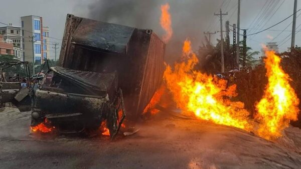 এসময় মহাসড়কে জ্যামে আটকে পড়া একটি কভারভ্যান চালু করার সময় কভার্ডভ্যানের ধুয়া গ্যাসের লিকেজে যাওয়ার সাথে সাথে কভারভ্যানে আগুন লেগে যায়। মুর্হুতের মধ্যে আগুনের লেলিহান শিখা পুরো কভারভ্যানে ছড়িয়ে পড়ে। খবর পেয়ে সোনারগাঁ ফায়ার সার্ভিসের দুটি ইউনিটি ঘটনাস্থলে এসে ১ ঘন্টার চেষ্টার পর আগুন নিয়ন্ত্রনে আসে।