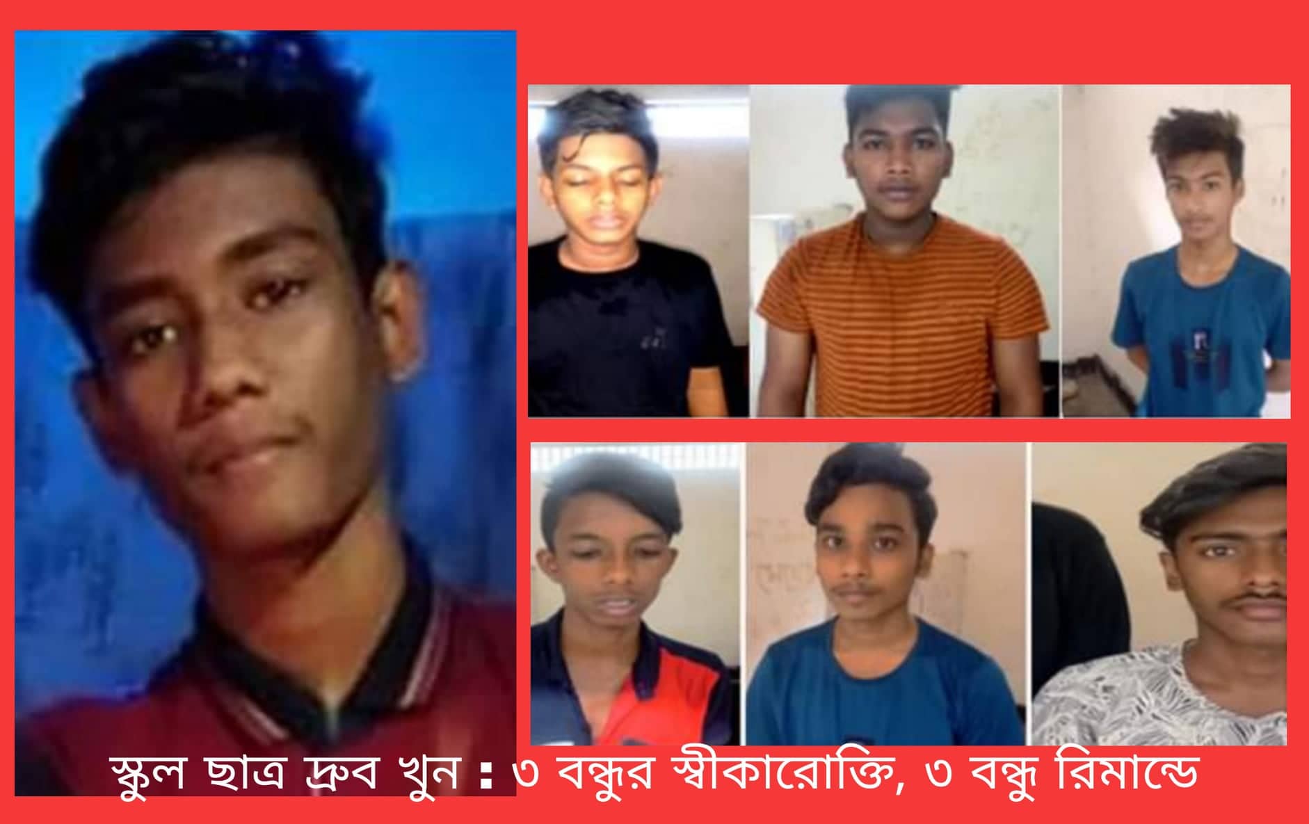 নারায়ণগঞ্জ সদর উপজেলার ফতুল্লার ইসদাইরে ছুরিকাঘাতে নিহত ধ্রুব চন্দ্র দাস (১৬) হত্যার ঘটনায় গ্রেফতারকৃত ৩ বন্ধু আদালতে বন্দু দ্রুবকে হত্যাকান্ডের দায় স্বীকার করে জবানবন্দী দিয়েছে।