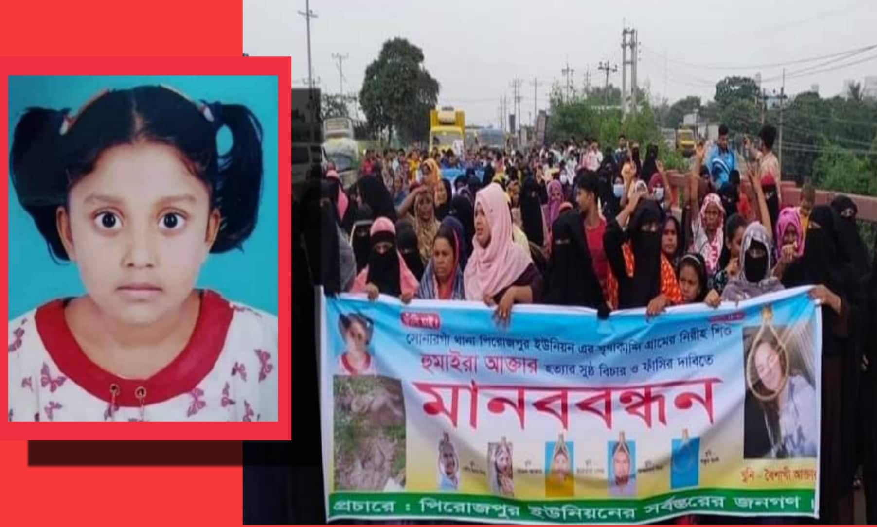 সোনারগাঁ উপজেলার পিরোজপুর ইউনিয়নের মৃধাকান্দি এলাকায় আলোচিত হুমায়রা হত্যা মামলার আসামী তার ভাবি বৈশাখী ও অন্যান্য আসামীদের বিরুদ্ধে নিহত হুমায়রার স্বজন, নাগেরগাঁও সরকারি প্রাথমিক বিদ্যালয়ের শিক্ষার্থীবৃন্দ ও শতশত এলাকাবাসী মানববন্ধন ও বিক্ষোভ করেছে।