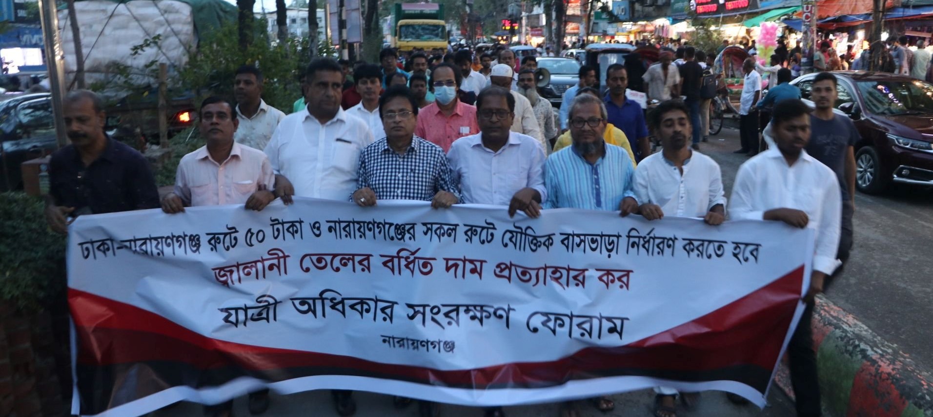ঢাকা-নারায়ণগঞ্জ রুটে বাসভাড়া ৫০ টাকা ও নারায়ণগঞ্জের সব রুটে যৌক্তিক ভাড়া নির্ধারণের দাবিতে এবং জ্বালানি তেলের অস্বাভাবিক মূল্য বৃদ্ধির প্রতিবাদে সমাবেশ ও বিক্ষোভ মিছিল অনুষ্ঠিত হয়েছে।