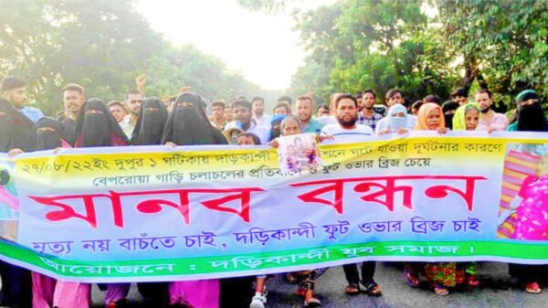 ফুটওভার ব্রিজের দাবিতে নারায়ণগঞ্জের সোনারগাঁ উপজেলার দড়িকান্দী এলাকায় ঢাকা-চট্টগ্রাম মহাসড়ক অবরোধ করে বিক্ষোভ ও মানববন্ধন করা হয়েছে। সোমবার (২৯ আগস্ট) বিকেলে স্থানীয় বিভিন্ন স্কুল-কলেজের শিক্ষার্থী ও এলাকাবাসী এ কর্মসূচি পালন করে।