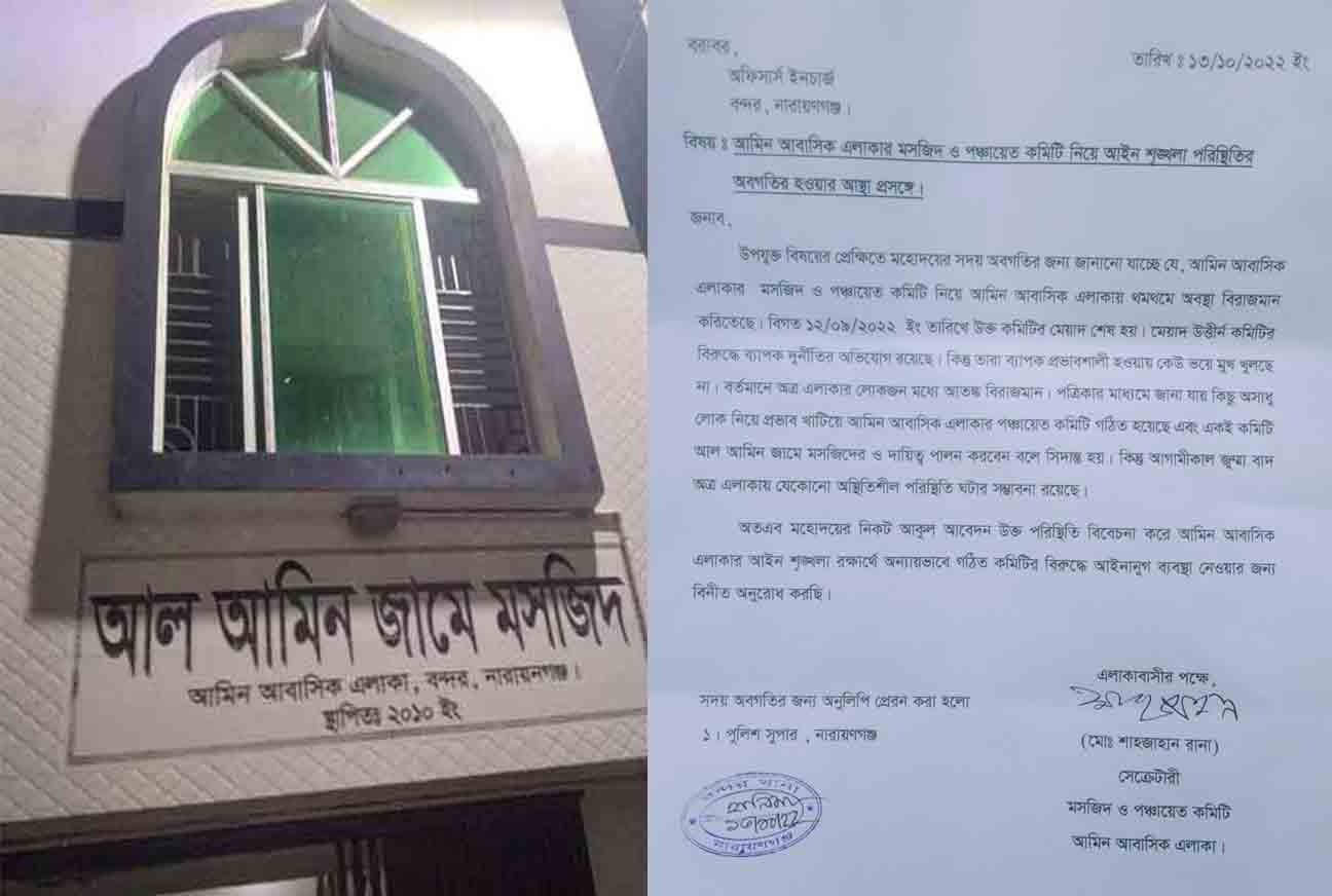 তাই মসজিদ কমিটির বেশির ভাগ সদস্যরা নির্বাচিত সাধারন সম্পাদক শাহজাহান রানাকে নিয়ে ওই অবৈধ কমিটির বিরোদ্ধে ব্যবস্থা পূর্বক আইন শৃঙ্খলা সমুন্নত রাখতে বন্দর থানা প্রশাসনের বরাবরে একটি স্বারক লিপি প্রদান করেছে।