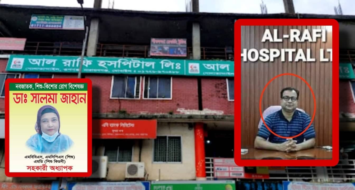 জানা যায়, নারায়ণগঞ্জের রূপগঞ্জ উপজেলার ঢাকা সিলেট মহাসড়কের পাশে ভুলতা গোলাকান্দাইল এলাকার আল রাফি হাসপাতালে ভুল চিকিৎসায় চার দিন বয়সের কন্যা শিশুর মৃতু হয়। শিশুটি সোনারগাঁও উপজেলার নোয়াপুর এলাকার সাউফুদ্দিনের মেয়ে।