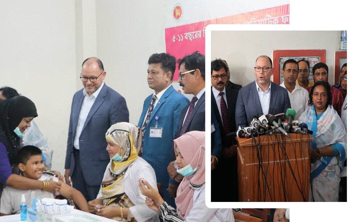 রাষ্ট্রদূত পিটার ডি হাস বলেন, করোনা সংকটের শুরু থেকে যুক্তরাষ্ট্র বাংলাদেশে ১০০ মিলিয়ন ডোজ টিকা দিয়েছে। মহামারি মোকাবিলায় যুক্তরাষ্ট্র ও বাংলাদেশের অংশীদারত্ব এ মাইলফলক অতিক্রম করেছে। চলতি সপ্তাহের শুরুতে বাংলাদেশের শিশুদের জন্য ফাইজারের আরও ছয় মিলিয়ন ডোজ টিকা দিয়েছে যুক্তরাষ্ট্র। যুক্তরাষ্ট্র বাংলাদেশের সবচেয়ে বড় টিকাদাতা দেশ। বাংলাদেশের মোট টিকার ৭০ শতাংশের বেশি অনুদান দিয়েছে আমেরিকা। ৫০ বছরের বন্ধুত্বের সম্পর্কে এটি বাংলাদেশের জন্য উৎকৃষ্ট উদাহরণ।