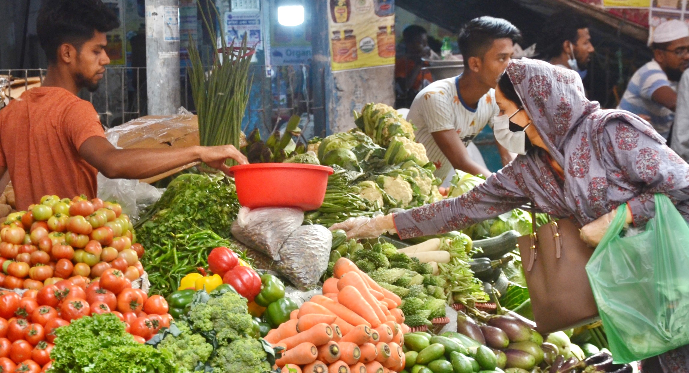 বাজারে অধিকাংশ সবজি আগের দামে বিক্রি হচ্ছে। আকার ভেদে ফুলকপি বিক্রি হচ্ছে ৫০-৬০ টাকায় । শসা প্রতি কেজি বিক্রি হচ্ছে ৬০- ৮০-৯০ টাকায়। লম্বা বেগুনের কেজি ৯০ টাকা, গোল বেগুন বিক্রি হচ্ছে ১৩০ টাকা কেজিতে। টমেটো ১২০, শিম ১০০-১১০, করলা ৬০-৭০ টাকায় পাওয়া যাচ্ছে।