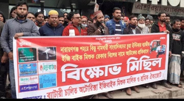 নারায়ণগঞ্জে নামধারী কথিত সাংবাদিকদের দেওয়া স্টিকার ব্যতীত সড়কে চলাচলকারী ব্যাটারিচালিত অটোরিকশার বিরুদ্ধে অভিযান চালিয়ে রেকার বিল আদায়ের প্রতিবাদে মানববন্ধন করেছে ইজিবাইক চালক ও মালিকরা।