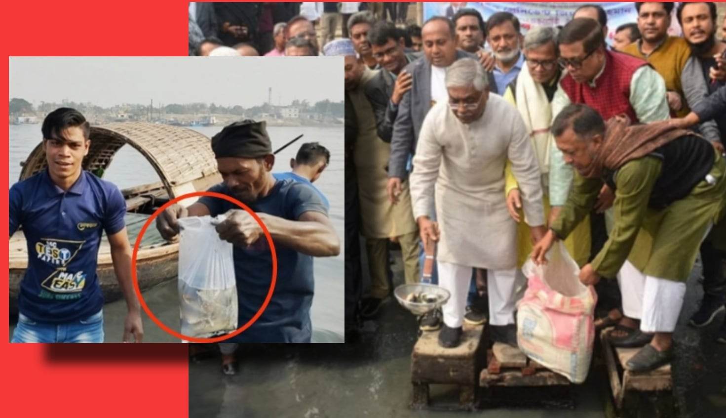 শীতলক্ষ্যা নদীর পানিতে মাছের পোনামাছ অবমুক্ত করেছেন মৎস্যজীবী দলের নেতারা। এর ঘণ্টাখানেকের মধ্যেই সব মাছ মরে পানিতে ভেসে ওঠে। পানির ঢেউয়ে কিনারে চলে আসা মরা পোনাগুলো তুলে নিয়ে যান স্থানীয়রা।