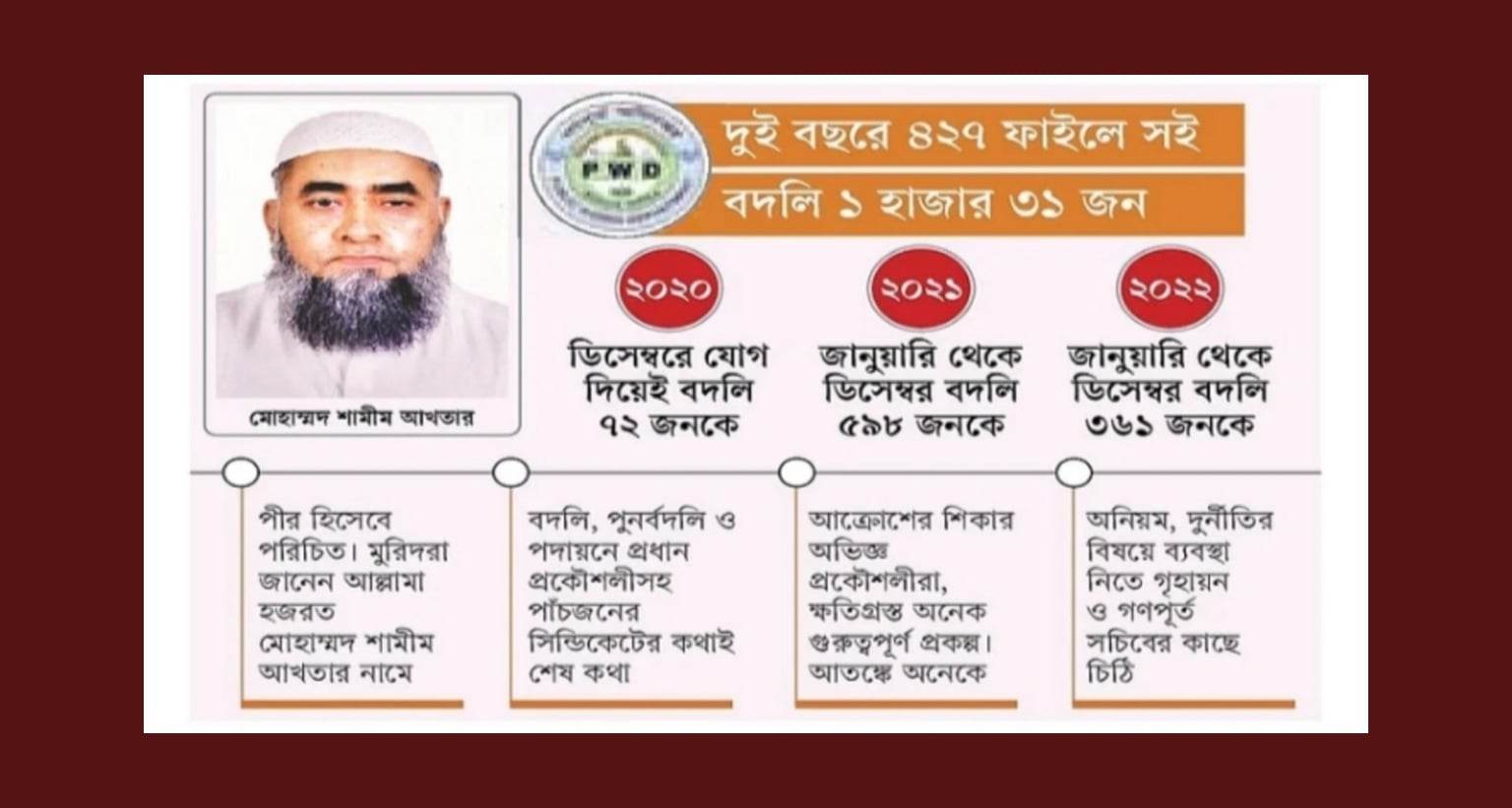 দায়িত্ব পালনের দুই বছরেই বদলি, পুনর্বদলির ও পদায়নের রেকর্ড গড়েছেন গণপূর্ত অধিদপ্তরের প্রধান প্রকৌশলী মোহাম্মদ শামীম আখতার। এ সংক্রান্ত ৪২৭টি ফাইলে সই করেছেন তিনি। এর মধ্য দিয়ে ১ হাজার ৩১ কর্মকর্তা-কর্মচারীর বদলি, পুনর্বদলি ও পদায়ন হয়েছে। এত অল্প সময়ে রেকর্ডসংখ্যক কর্মকর্তা-কর্মচারীর বদলি, পুনর্বদলি ও পদায়ন এর আগে কখনো হয়নি।