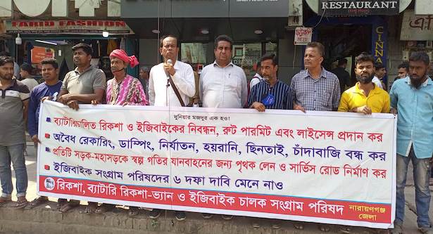 পুরিশ ও সন্ত্রাসীদের চাঁদাবজি বন্ধ, হয়রানীসহ নানা দাবিতে মানববন্ধন করেছে রিকশা, ব্যাটারি রিকশা-ভ্যান ও ইজিবাইক সংগ্রাম পরিষদ নারায়ণগঞ্জ জেলা।