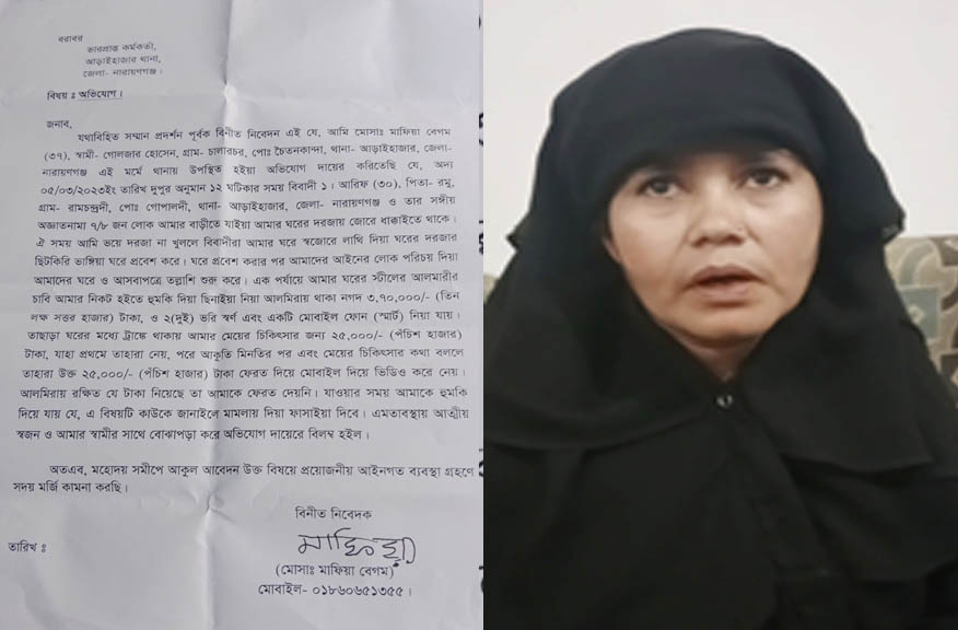 মাফিয়া আরো জানান, “আমার ঘর থেকে নগদ টাকা ও স্বর্ণারংকার লুটে নেয়ার ঘটনাটি ধামাচাপা দেয়ার জন্য আমার স্বামীর নামে মিথ্যা মাদক মামলা দেয়া হয়েছে।