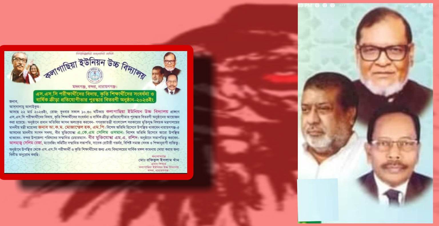 এমন নারায়ণগঞ্জের কুখ্যাত রাজাকার পুত্রদের আস্ফালনের ধারাবাহিকতায় এবার আগামীকাল ২২ মার্চ বুধবার সকালে বন্দর উপজেলার কলাগাছিয়া ইউনিয়ন উচ্চ বিদ্যালয়ের এসএসসি পরীক্ষার্থীদের বিদায়, কৃতি শিক্ষার্থীদের সংবর্ধনা ও বার্ষিক ক্রীড়া প্রতিযোগিতার পুরস্কার বিতরণ অনুষ্ঠানে প্রধান অতিথি হিসেবে উপস্থিত থাকবেন খোদ মুক্তিযুদ্ধ বিষয়ক মন্ত্রী বীর মুক্তিযোদ্ধা আ.ক.ম মোজাম্মেল হক। এই অনুষ্ঠানে বিশেষ অতিথে হিসেবে উপস্থিত থাকবেন নারায়ণগঞ্জ সদর আসনের সংসদ সদস্য বীর মুক্তিযোদ্ধা এ,কে,এম সেলিম ওসমান। এ ছাড়াও এই অনুষ্ঠানে আরো উপস্থিত থাকবেন বন্দর উপজেলা পরিষদের চেয়ারম্যান ও বীর মুক্তিযোদ্ধা এম এ রশিদসহ আরো কয়েকজন মুক্তিযোদ্ধা ও গণ্যমান্য ব্যক্তিবর্গ উপস্থিত থাকবেন।