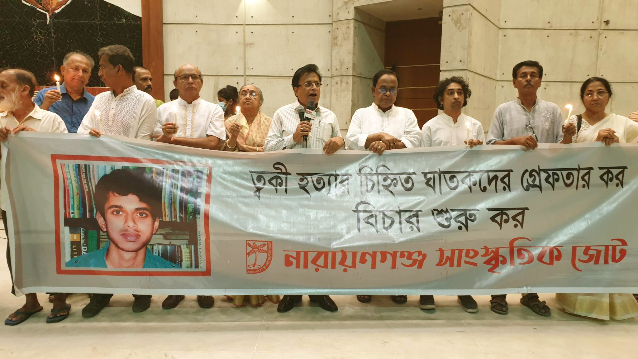 সেই  চাঞ্চল্যকর ত্বকী হত্যার ১২১ মাস উপলক্ষে ৮ এপ্রিল সন্ধ্যায় প্রতি মাসের ৮ তারিখের মতো এরারো প্রতিবাদ করেছে  নারায়ণগঞ্জ সাংস্কৃতিক জোট। আন্দোলনের ধারাবাহিকতায় এবারো নগরীর আলী আহাম্মদ চুনকা নগর মিলনায়তন প্রাঙ্গণে আলোক প্রজ্বালন কর্মসূচি অনুষ্ঠিত হয়েছে।