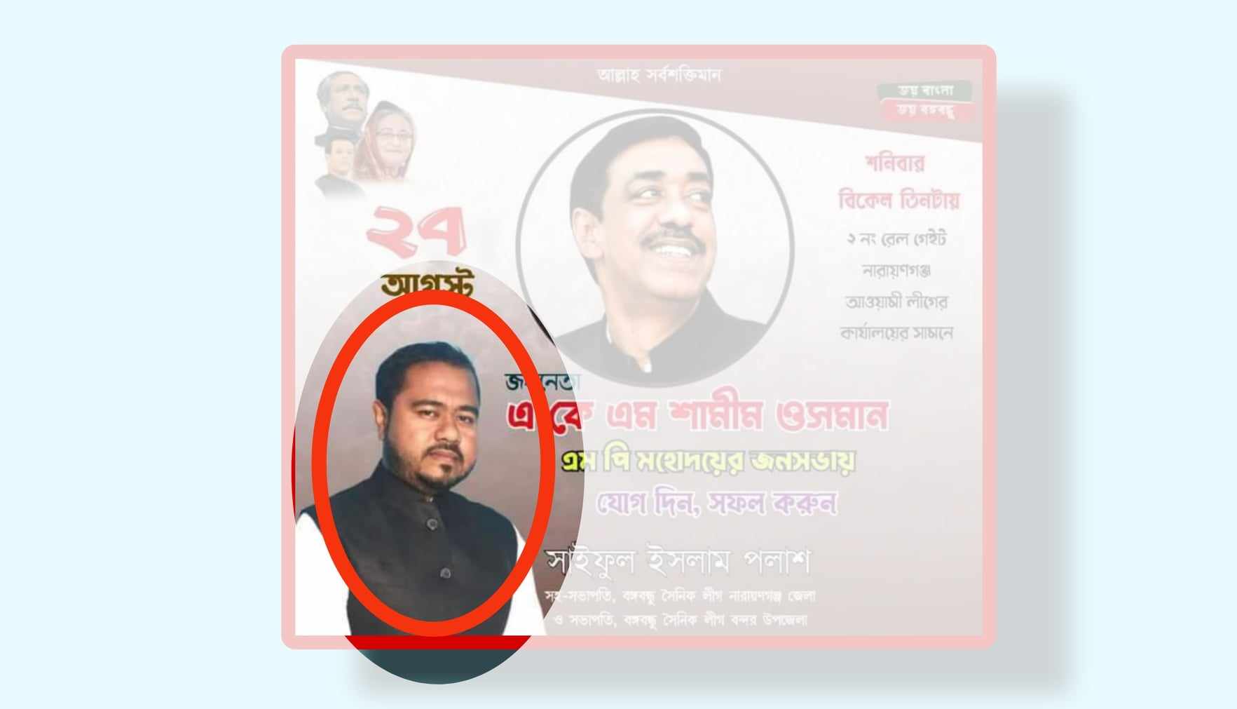 এদিকে বন্দর উপজেলায় খোঁজ নিয়ে জানা গেছে, পলাশের বাড়ি বন্দর উপজেলার মদনপুর ইউনিয়নের কেওডালা এলাকায়। বর্তমানে ইটভাটার ব্যবসা করেন। মদনপুর ইউনিয়নের চেয়ারম্যান গাজী এম এ সালামের মাধ্যমে রাজনীতিতে আসেন তিনি। তার সুপারিশেই তিনি বঙ্গবন্ধু সৈনিক লীগের কমিটিতে জায়গা পান। তিন বছর আগে বন্দর উপজেলার বঙ্গবন্ধু সৈনিক লীগের সভাপতি হন পলাশ। এরপর হন জেলা কমিটির সহ সভাপতি। মূলত, সালাম চেয়ারম্যানের সঙ্গেই তিনি রাজনীতি করেন।