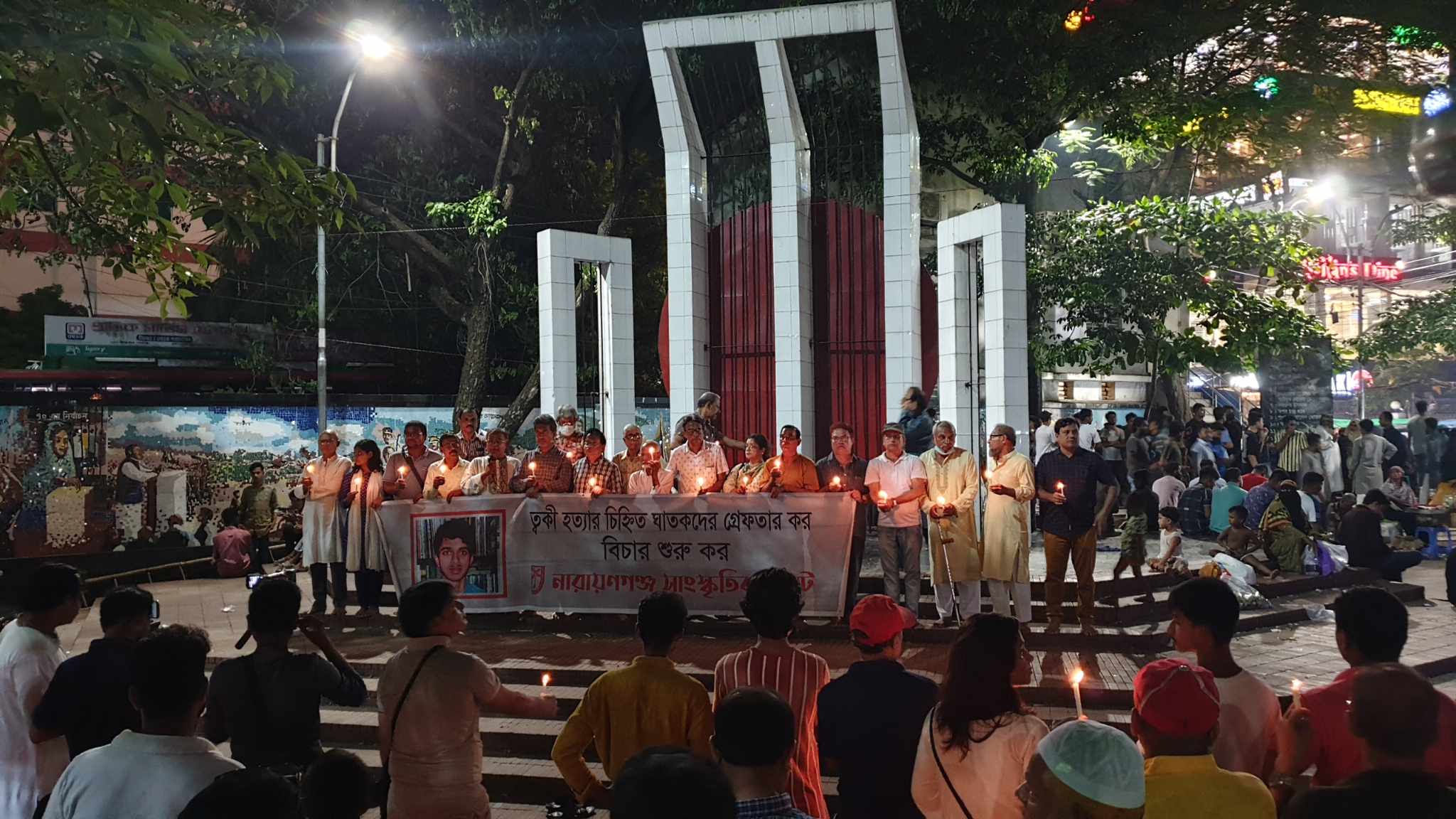 উল্লেখ্য, ২০১৩ সালের ৬ মার্চ নগরীর শায়েস্তা খাঁ রোডের বাসা থেকে বের হওয়ার পর নিখোঁজ হয় মেধাবী ছাত্র তানভীর মুহাম্মদ ত্বকী। দুদিন পর ৮ মার্চ শীতলক্ষ্যা নদীর কুমুদিনী শাখা খাল থেকে ত্বকীর লাশ উদ্ধার করে পুলিশ। ওই বছরের ১২ নভেম্বর আজমেরী ওসমানের সহযোগী সুলতান শওকত ভ্রমর আদালতে ১৬৪ ধারায় স্বীকারোক্তিমূলক জবানবন্দিতে জানায়, আজমেরী ওসমানের নেতৃত্বে ত্বকীকে অপহরণের পর হত্যা করা হয়। এর পর থেকে ত্বকীর হত্যার বিচার শুরু ও চিহ্নিত আসামীদের গ্রেপ্তারের দাবিতে প্রতি মাসের ৮ তারিখ আলোক প্রজ্বালন কর্মসূচি পালন করে আসছে নারায়ণগঞ্জ সাংস্কৃতিক জোট।