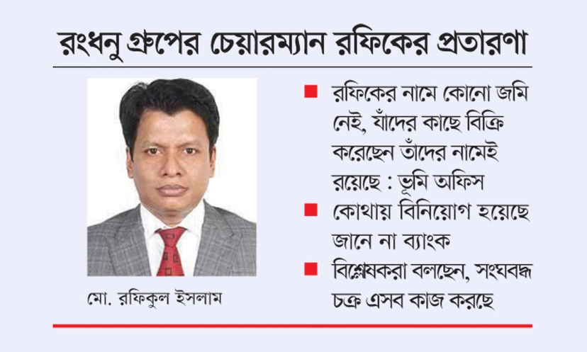 তথ্য গোপন করে বিক্রি করে দেওয়া জমির দলিল বন্ধক রেখে ফার্স্ট সিকিউরিটি ইসলামী ব্যাংক থেকে ২৭০ কোটি টাকা ঋণ নিয়েছেন রংধনু গ্রুপের চেয়ারম্যান রফিকুল ইসলাম। ২০২২ সালের শেষের দিকে এসব জমি বিক্রি করে দিলেও ঋণ নিয়েছেন চলতি বছরের জুন মাসে।