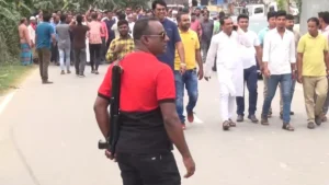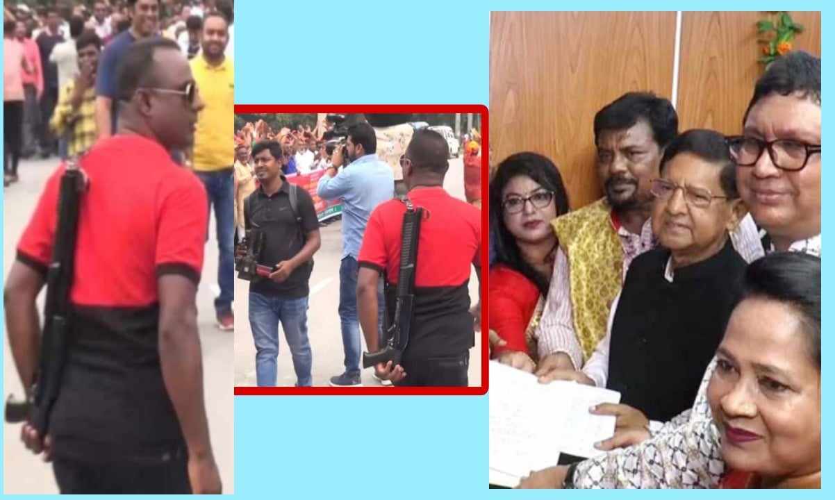 শত শত নেতাকর্মী ও সমর্থকদের মিছিলের একেবারে সামনে ও মাঝখানে লাল রঙের গেঞ্জি পড়া অস্ত্রধারী এক ব্যক্তিকে প্রকাশ্যে অবস্থান নিতে ও মহড়া দিতে দেখা যায়। তিনি মন্ত্রীর বডিগার্ড কিনা জানতে চাইলে বলেন, ‘আমি অন্য একজনের ডিউটি করি। মিছিলে আমার স্যার আছে।’ তবে তিনি তার নাম পরিচয় বলেন নি।তিনি মন্ত্রীর সঙ্গে না থেকে মিছিলের সবার সামনে কেন মহড়া দিচ্ছেন এই প্রশ্ন করলে ওই ব্যক্তি কোনো জবাব না দিয়ে দ্রুত মিছিলের ভেতরে ঢুকে পড়েন।