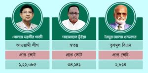 আওয়ামীলীগ প্রার্থী নজরুল ইসলাম বাবু নৌকা প্রতীকে পেয়েছেন ১ লাখ ৬৮ হাজার ২৪২ ভোট। তার নিকটতম প্রতিদ্বন্ধি জাতীয় পাটির আলমগীর সিকদার লোটন লাঙ্গল প্রতীকে পেয়েছেন ৭ হাজার ২শ ৫৬ ভোট। এর আগেও নজরুল ইসলাম বাবু এ আসনের এমপি ছিলেন।
