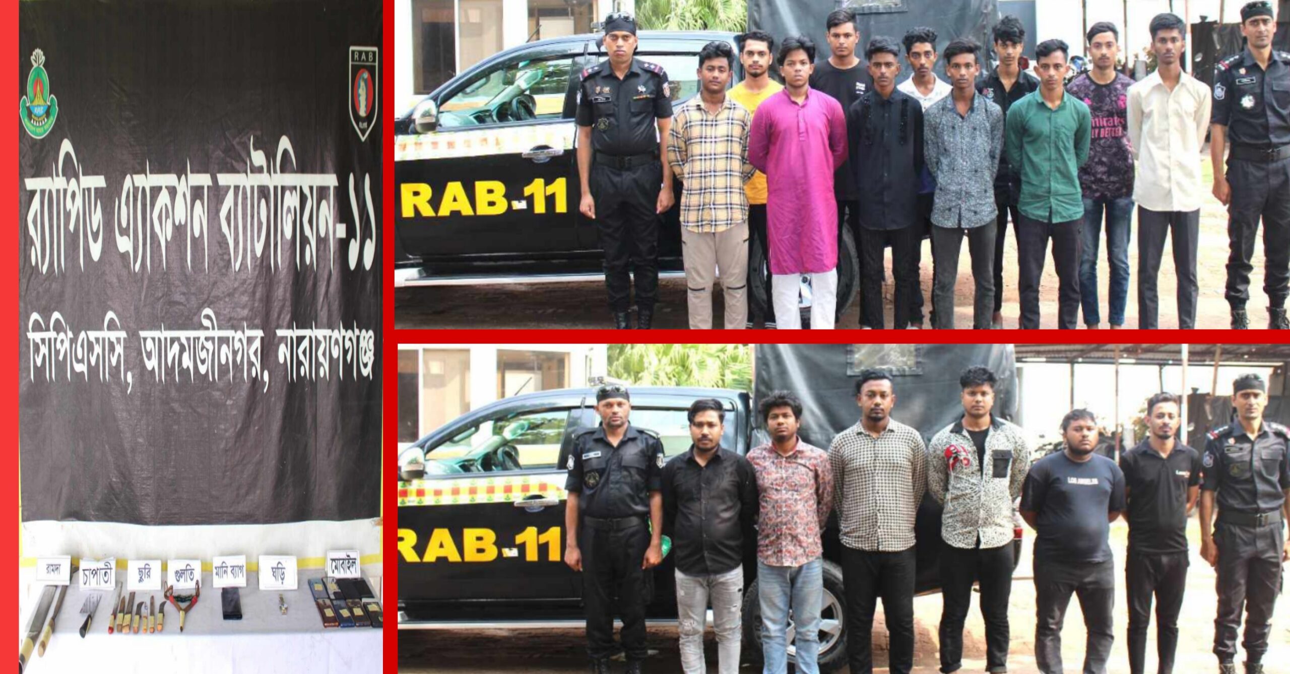 সিদ্ধিরগঞ্জে “টেনশন গ্রুপ” এবং “ডেভিল এক্সো গ্রুপ” দুই কিশোর গ্যাংয়ের ১৭ সদস্যকে আটক করেছে র্যাব-১১।