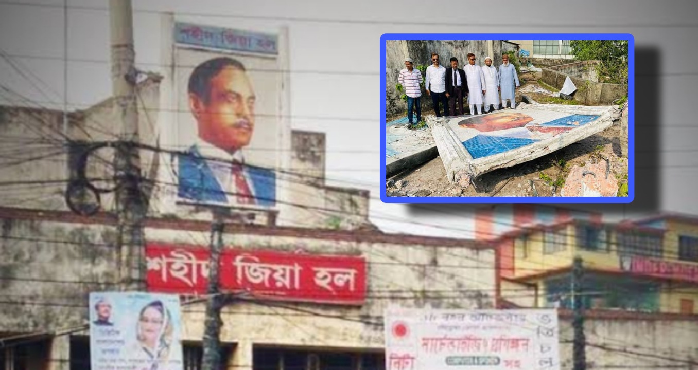 নগরীর চাষাঢ়ায় শহীদ জিয়া হল মিলনায়তনে বিএনপির প্রতিষ্ঠাতা ও প্রয়াত রাষ্ট্রপতি জিয়াউর রহমানের ম্যুরালটি ভেঙে ফেলা হয়েছে।