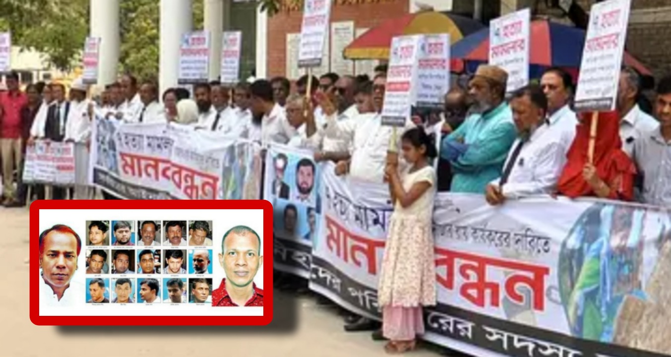 ৭ খুন মামলার বাদীপক্ষের আইনজীবী সাখাওয়াত হোসেনের সভাপতিত্বে মানববন্ধনে বক্তব্য দেন নিহত আইনজীবী চন্দন সরকারের ভাগনে প্রিয়তম কুমার দেব, নিহত মনিরুজ্জামানের (স্বপন) গাড়িচালক জাহাঙ্গীর আলমের স্ত্রী সামসুন নাহার (নুপুর) প্রমুখ।