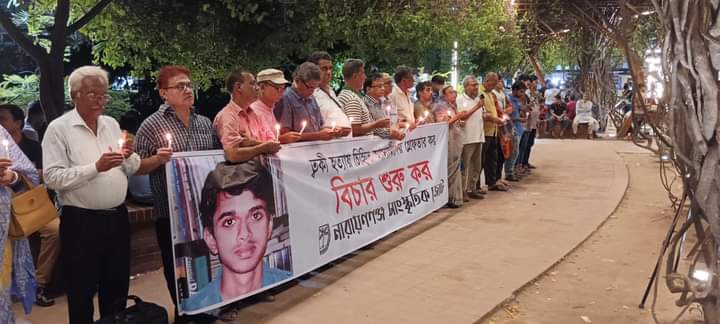 নারায়ণগঞ্জ সাংস্কৃতিক জোট আয়োজিত ‘মোমশিখা প্রজ্জ্বালন কর্মসূচি’তে সভাপতিত্ব করেন সংগঠনের সভাপতি জিয়াউল ইসলাম। সাধারণ সম্পাদক ধীমান সাহার সঞ্চালনায় আয়োজিত অনুষ্ঠানে বক্তব্য দেন নিহত ত্বকীর বাবা সাংস্কৃতিক ব্যক্তিত্ব রফিউর রাব্বি, খেলাঘর কেন্দ্রীয় কমিটির সহসভাপতি রথীন চক্রবর্তী, সন্ত্রাস নির্মূল ত্বকী মঞ্চের সদস্যসচিব হালিম আজাদ, নারায়ণগঞ্জ সাংস্কৃতিক জোটের সাবেক সভাপতি ভবানী শংকর, নারায়ণগঞ্জ নাগরিক কমিটির সাধারণ সম্পাদক জাহিদুল হক, ন্যাপের জেলা সাধারণ সম্পাদক আওলাদ হোসেন, বাসদের জেলা সদস্যসচিব আবু নাঈম, গণসংহতি আন্দোলনের জেলা সমন্বয়ক তরিকুল সুজন, বাংলাদেশ মহিলা পরিষদের শহর কমিটির সাধারণ সম্পাদক শাহানারা বেগম, সামাজিক সংগঠন সমমনার সাবেক সভাপতি দুলাল সাহাসহ অন্যান্যদের উপস্থিতিতে রফিউর রাব্বি বলেন, সরকারের অনিচ্ছার কারণে ১১ বছরেও ত্বকী হত্যার তদন্ত শেষে র‌্যাবের তৈরি করে রাখা অভিযোগপত্রটি আদালতে পেশ করা হয়নি। সরকার ত্বকীর ঘাতকদের নিরাপত্তা দানের মধ্য দিয়ে দেশে সামাজিক ও রাজনৈতিক দুর্বৃত্তায়ন প্রতিষ্ঠা করেছে, নারায়ণগঞ্জসহ সারা দেশে মাফিয়াতন্ত্র প্রতিষ্ঠা করেছে।
