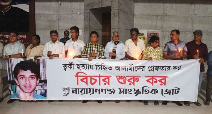নারায়ণগঞ্জ সাংস্কৃতিক জোটের সভাপতি জিয়াউল ইসলামের (কাজল) সভাপতিত্বে ও সাধারণ সম্পাদক ধীমান সাহার (জুয়েল) সঞ্চালনায় অনুষ্ঠানে বক্তব্য দেন ত্বকীর বাবা সাংস্কৃতিক ব্যক্তিত্ব রফিউর রাব্বি, খেলাঘরের কেন্দ্রীয় কমিটির সহসভাপতি রথীন চক্রবর্তী, সন্ত্রাস নির্মূল ত্বকী মঞ্চের সদস্য সচিব হালিম আজাদ, গণসংহতি আন্দোলনের জেলা সমন্বয়ক তরিকুল সুজন, সামাজিক সংগঠক সমমনার সভাপতি সালাহউদ্দিন আহমেদ, উপদেষ্টা দুলাল সাহা, সিপিবির শহর কমিটির সাধারণ সম্পাদক সুজয় রায় চৌধুরী, বিপ্লবী ওয়ার্কার্স পার্টির জেলা নেত্রী রাশিদা বেগমসহ অন্যান্যদের উপস্থিতিতে রফিউর রাব্বি আরো বলেন, ‘শামীম ওসমান হাজার হাজার কোটি টাকা বিদেশে পাচার করলেও দুদক কখনো তাঁর বিরুদ্ধে তদন্ত করেনি। অন্য দেশের নাগরিকত্ব নিয়ে সংবিধান লঙ্ঘন করে দেশের আইনপ্রণেতা হলেও দুদক তা দেখে না। শেখ হাসিনা দেশ ছেড়ে পালিয়ে গেলে দুদকের টনক নড়ে। ত্বকী হত্যার পাশাপাশি সাগর-রুনি, তনু, বুলু, মিঠু ও ওসমান পরিবার দ্বারা নিহত সব হত্যা এবং গত জুলাই-আগস্টে শেখ হাসিনার নির্দেশে গণহত্যার বিচার করতে হবে। এই সরকার সেই বিচার না করলে আগের মতো গণ–আদালত তৈরি করে চব্বিশের গণহত্যার বিচার আদায় করা হবে।’
