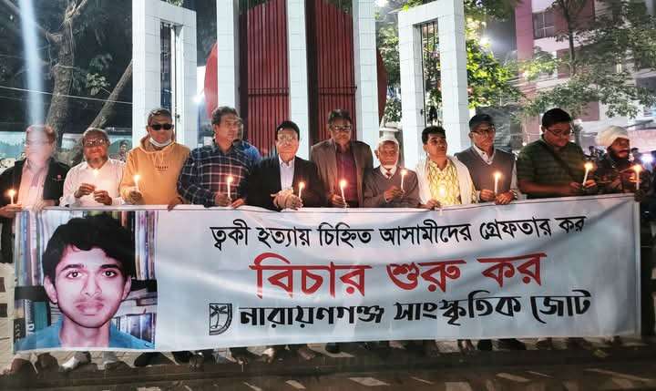 এভাবেই তানভীর মুহাম্মদ ত্বকী হত্যা ও বিচারহীনতার ১৪১ মাস উপলক্ষে রবিবার সন্ধ্যায় নারায়ণগঞ্জ কেন্দ্রীয় শহীদ মিনারে নারায়ণগঞ্জ সাংস্কৃতিক জোট আয়োজিত আলোক প্রজ্বালন কর্মসূচিতে সন্ত্রাস নির্মূল ত্বকী মঞ্চের আহবায়ক রফিউর রাব্বি এমন মন্তব্য করেন।