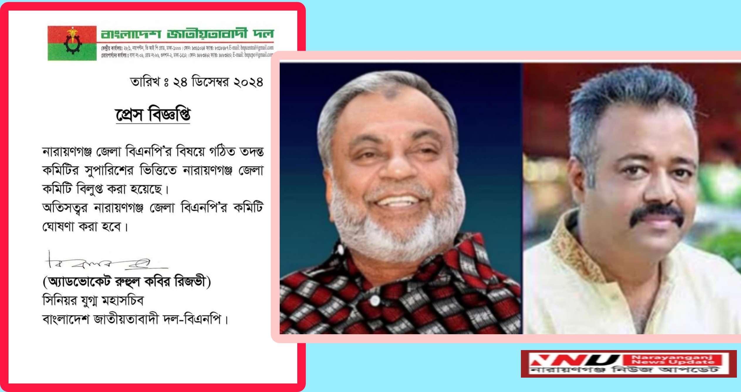 বিএনপির ওই বিজ্ঞপ্তিতে জানানো হয়েছে, ‘নারায়ণগঞ্জ জেলা বিএনপির বিষয়ে গঠিত তদন্ত কমিটির সুপারিশের ভিত্তিতে কমিটি বিলুপ্ত করা হয়েছে। অতিসত্বর নারায়ণগঞ্জ জেলা বিএনপির কমিটি ঘোষণা করা হবে।’